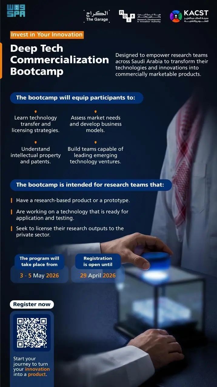 The bootcamp will take place at The Garage in Riyadh from May 3 to 5, 2026. It is designed to support researchers and innovators by providing an enabling environment and equipping them with the tools and skills needed to turn their innovation projects into successful investment-ready ventures. The program will also help participants address the commercialization challenges associated with deep technologies and channel innovation toward supporting national development priorities.