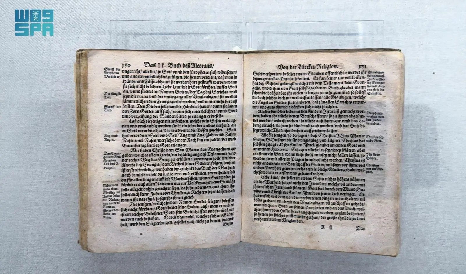 The Holy Quran Museum in the Hira Cultural District is displaying a rare copy of the first translation of the meanings of the Holy Quran into German, printed in 1623 CE (1032 AH) in the German city of Nuremberg, as part of its collection documenting the history of the Holy Quran and its translations throughout the ages.